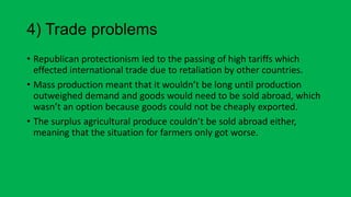 Low prices for agricultural products. - key basic industries barely made a profit - agriculture suffered more than any other part of the economy. 2 Farming problems American farmers annual income was 477 below the national average.